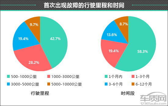 在这些出现非人为故障的车辆中,首次故障出现在行驶里程500-1000公里的占比最高,为42.7%。而对于出现故障时间段的调查结果显示,接近六成的车主表示车辆在购车1个月内便出现了故障。