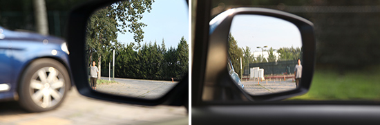 斯巴鲁XV后视镜面积相当大,对于后方视野的照顾比较全面,但由于没有采用双曲面镜较为遗憾,导致测试结果可视视野面积不是很突出。但在试驾过程中,宽大的后视镜可以提供丰富的路面信息,日常使用不受影响。