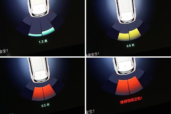 虚拟影像提供测距功能,且伴随车辆与障碍物间距离缩短,颜色与提示信息也会发生相应变化,对比实测数据可见二者最大误差在5-10cm之间,从车内看最终测试点时已采用文字提示,建议驾驶者立刻刹停。依实际感受而言,这项功能非常有助于驾驶者判断车身位置,虽然存在一定误差,但对于避免剐蹭事故发生立竿见影。