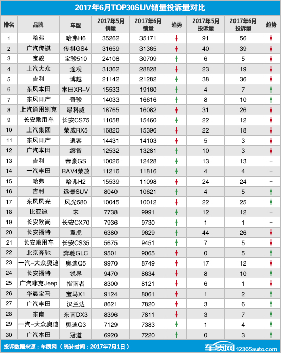 据乘联会提供的全国汽车产销数据显示,2017年6月国内SUV车型销量达72.1万辆,环比增长0.3%,同比增长17.7%,可见国内SUV市场依旧受到消费者的关注。同期,车质网接到车主针对SUV的有效投诉1495宗,环比增长2.5%,同比下降5.4%。6月SUV前四大典型投诉故障分别为变速器异响、发动机异响、变速箱顿挫及导航问题,投诉量均超过百宗,其中变速箱异响投诉达234宗,依然呈增长趋势。