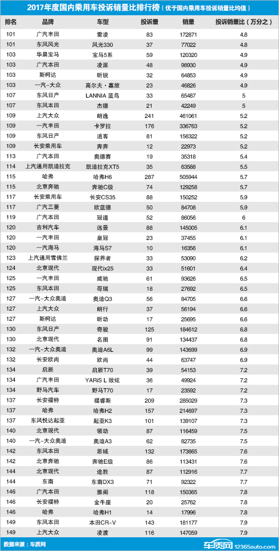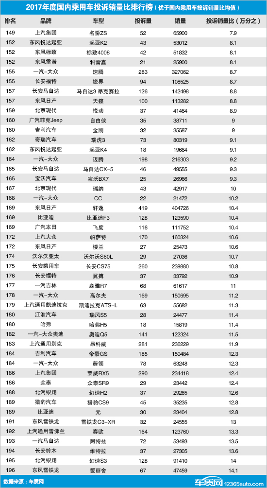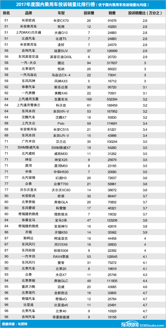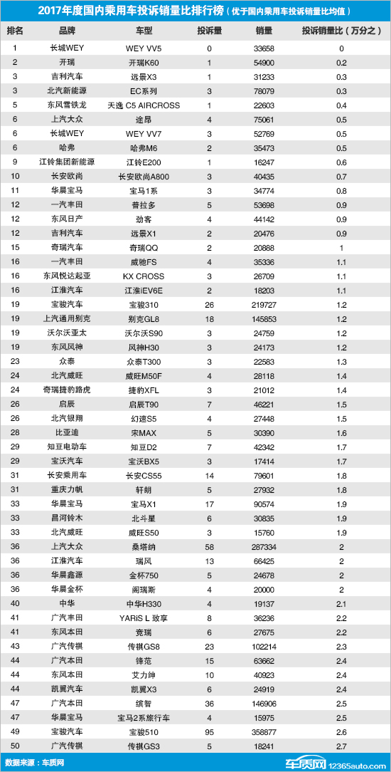 2017年度国内乘用车投诉销量比排行榜