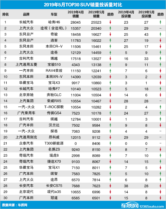 本月,“变速箱异响”问题依旧排名故障问题首位,投诉量保持在200宗以上。值得注意的是,本月“车身共振”问题投诉出现大幅上涨,较上月增长约1.6倍,主要集中在2019款沃尔沃XC60和S90车型中,投诉量持续攀升。去除投诉人自愿申请撤诉的信息后,2019年5月TOP30 SUV销量投诉量排名如下: