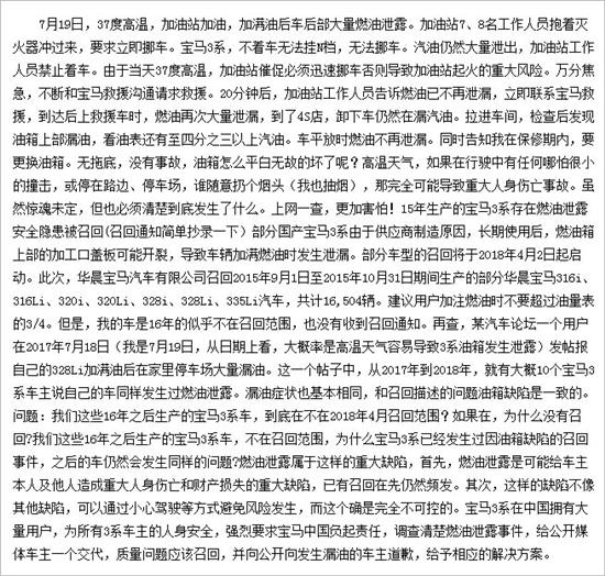 车质网注意到,其实召回实施半年内,网络上有关华晨宝马可能漏掉了召回批次的车主发帖并不鲜见,但无论是舆情还是车质网的实名客诉中信息显然都未能引起生产厂家华晨宝马的正确对应。而这种置若罔闻的后果就是,在华晨宝马宣布召回一年半以后,也就是厂家所说的“长期使用后”,2016款宝马3系燃油泄漏的情况开始密集出现。
