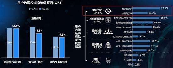 分析用户选择4S店维保的原因发现,质保期内、使用原厂配件和服务可靠有保障是主因,此外,34.6%的用户因经销商提供“优惠活动”而选择进店维保,用户选择经销商的原因较往年更加多样化且务实。