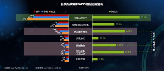 1、高频次使用品牌App有助于提升用户满意度。品牌App是品牌与用户之间沟通的重要载体。目前各品牌App的安装率均已超过80%。但用户对品牌App的使用频率存在明显差异。自主、合资和豪华品牌的多数用户,仅会在有需求时使用,使用场景集中在“车辆远程操控和诊断”,而新势力品牌,多数借助社区、商城等完善的功能,增加了用户黏性,培育了用户每日使用的习惯。