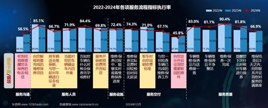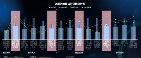 2024年,随保有量快速上升和渠道快速扩充及管理模式调整,新势力品牌对终端服务的管控优势明显减弱。调研中,整体执行率和售后服务满意度表现垫底。其中“保养提醒”、“维保时间无延误”、“车辆维保后一致性”和“提醒下次保养”等指标执行率偏弱。同时,售后服务满意度低于行业均值,尤其是“服务质量”维度,亟待改进。
