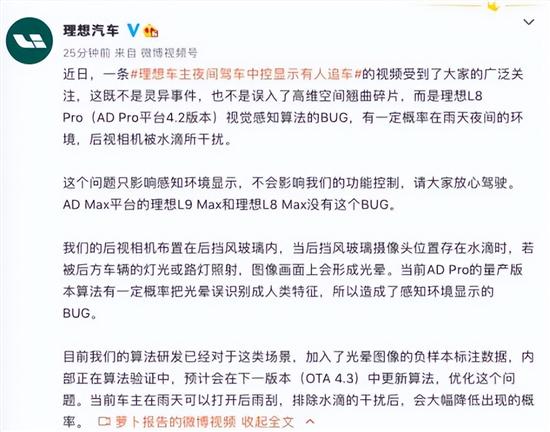 理想汽车官方发布,近日,一条理想车主夜间驾车中控显示有人追车的视频受到了大家的广泛关注,这既不是灵异事件,也不是误入了高维空间翘曲碎片,而是理想L8 Pro(AD Pro平台4.2版本)视觉感知算法的BUG,有一定概率在雨天夜间的环境,后视相机被水滴所干扰。这个问题只影响感知环境显示,不会影响我们的功能控制,请大家放心驾驶。AD Max平台的理想L9 Max和理想L8 Max没有这个BUG。