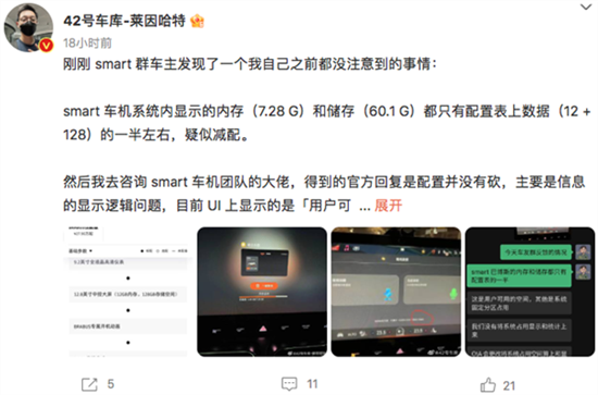 日前,据汽车博主爆料称,近日有smart精灵#1车主称,smart车机系统内显示的内存(7.28 G)和储存(60.1 G)都只有配置表上数据(12+128)的一半左右,疑似减配。