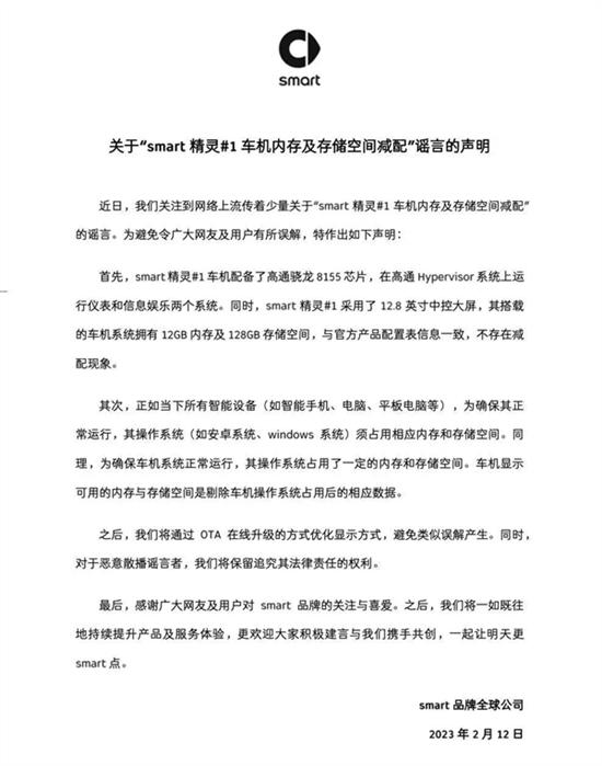 针对“smart精灵#1车机内存及存储空间减配”传闻,2月12日,smart品牌发布官方发布声明回应。smart在声明中表示: