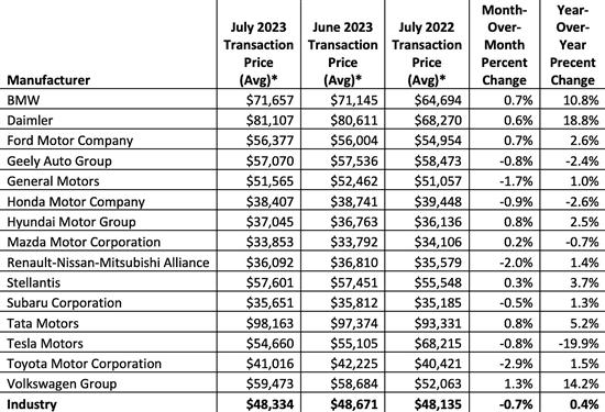7月份,特斯拉在美国的平均交易价格为54,660美元,较6月份的55,105美元下降了0.8%,但是较去年同期的68,215美元下降了19.9%。在过去一年中,特斯拉在美国的降价幅度是个各大汽车公司中最大的。降幅第二大的车企是本田汽车,从2022年7月到2023年7月,本田在美国的新车平均交易价格下降了2.6%。