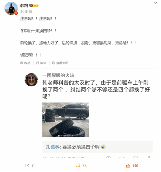 快科技12月15日消息,知名汽车博主韩路今日发文提醒网友,“冬季胎一定要换四条,单独换两条更危险”。