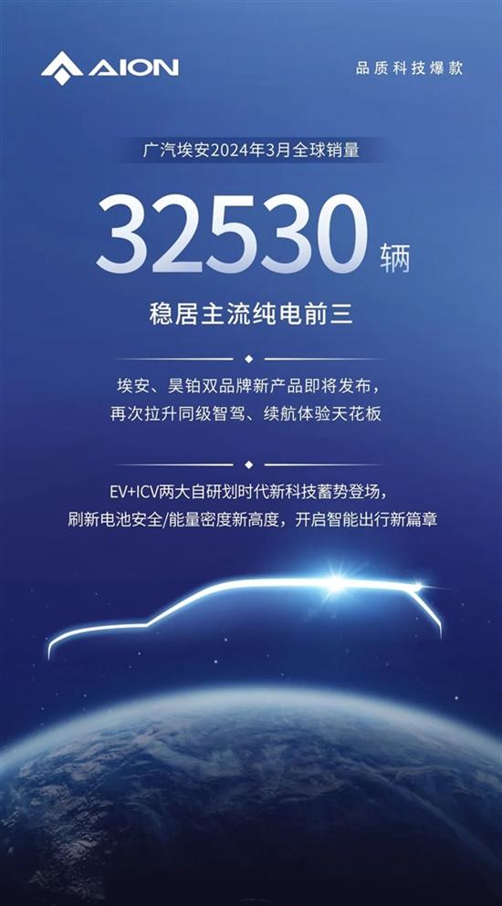 数据显示,广汽埃安3月全球销量达到32530辆,环比增长95.1%,稳居主流纯电车前三名。