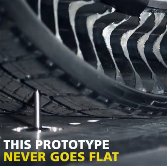 最重要的是,这种轮胎因为没有气体,不怕传统轮胎一样被扎刺,即便被长钉刺穿,对轮胎也没严重损害。