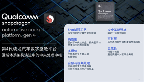 相对此前骁龙8155(7nm)GPU整体性能提升2倍、3D渲染性能提升3倍,并增加了集成电子后视镜、机器学习视觉(后置、环视)、乘客监测以及信息安全等功能,一颗芯片可带11块屏。