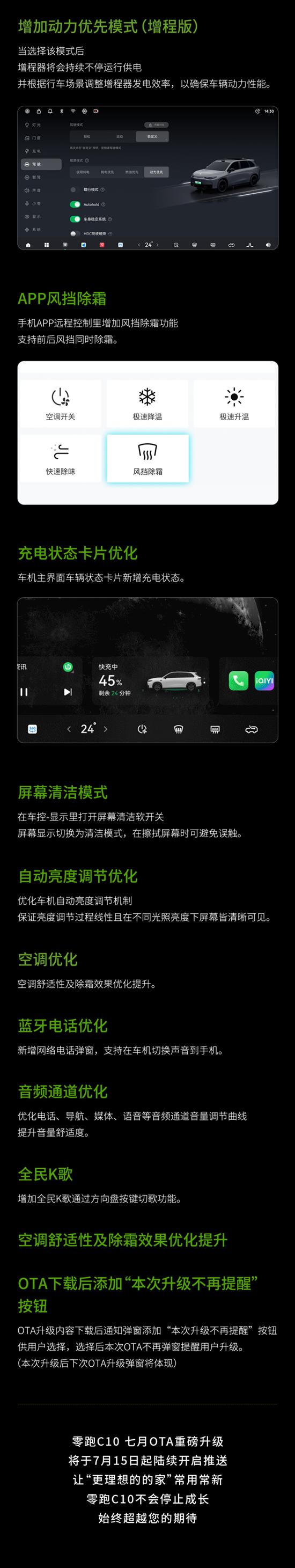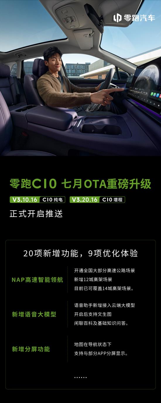 日前,零跑汽车旗下车型零跑C10、零跑C11、零跑C01车型进行OTA升级。其中零跑C10纯电和增程版车型推送V3.10.16版本,包括20项新增功能,9项优化体验。