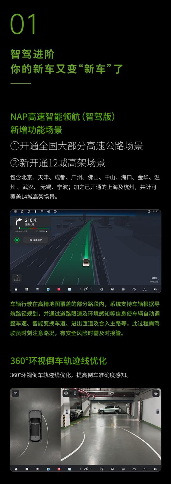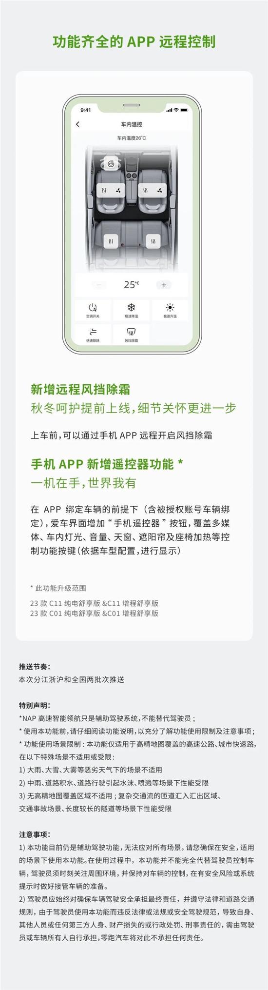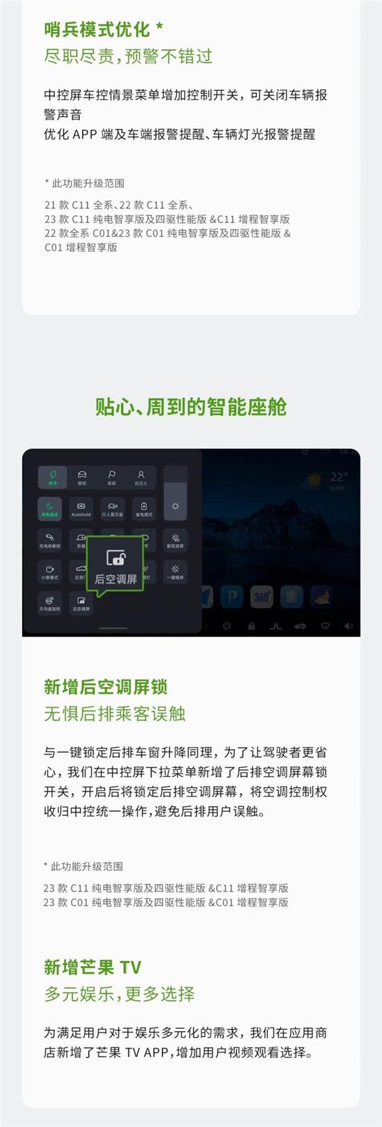 其次涉及本次OTA升级的还有21款、22 款、23款C11和C11增程,以及22款、23款C01和C01增程。并新增高速智能领航(NAP)功能、新增后空调屏锁、新增芒果TV。除此之外,也对APP远程控制,哨兵模式等功能进行了优化。