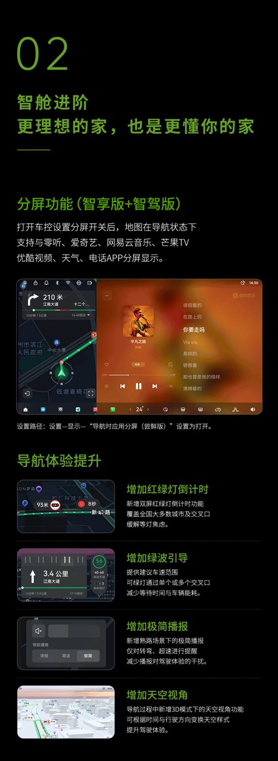 分屏功能可实现打开车控设置分屏开关后,地图在导航状态下支持与零听、爱奇艺、网易云音乐、芒果TV优酷视频、天气、电话APP分屏显示。另外,导航功能也进行了升级,增加了红绿灯倒计时、绿波引导等功能。此外,还新增地图应用APP、仪表时间显示等丰富功能。