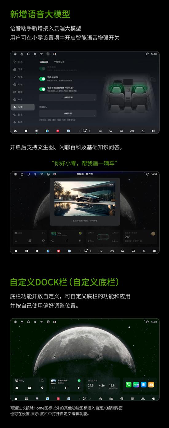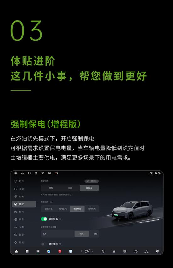 与此同时,零跑C10增程版车型增加强制保电功能,在燃油优先模式下,开启强制保电可根据需求设置保电电量,当车辆电量降低到设定值时由增程器主要供电,满足更多场景下的用电需求。以及动力优先模式,当选择该模式后增程器将会持续不停运行供电并根据行车场景调整增程器发电效率,以确保车辆动力性能。此外,还新增语音大模型和自定义DOCK栏功能。