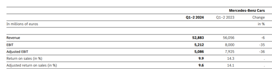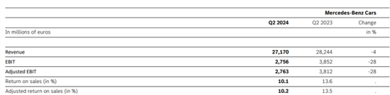 其中,梅赛德斯-奔驰集团汽车部门第二季度营收为271.70亿欧元,同比下降4%;调整后的息税前利润为27.63亿欧元,同比下降28%,而此前伦敦证券交易所集团(LSEG)预估会下降26%;调整后的销售回报率达10.2%,同比下降3.3个百分点。今年上半年,奔驰汽车部门营收为528.83亿欧元,同比下降6%;调整后的息税前利润为50.86亿欧元,同比下降36%;调整后的销售回报率达9.6%,同比下降4.5个百分点。