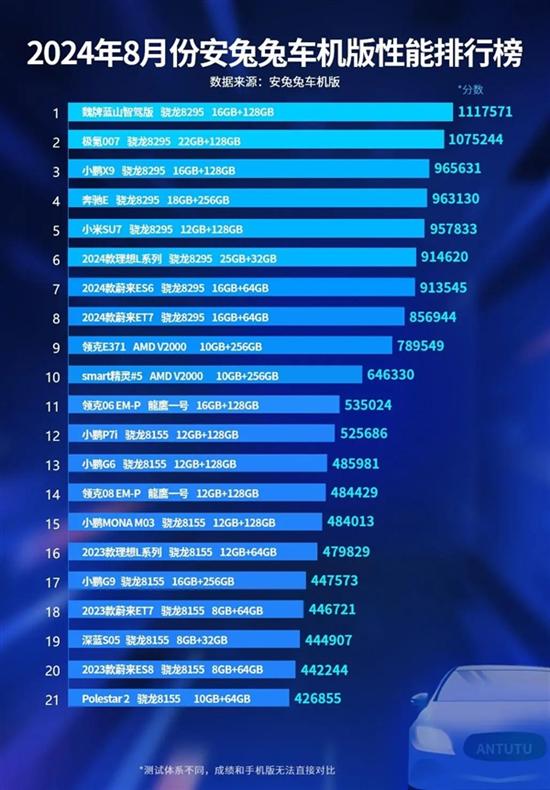 紧随其后的是极氪007,同样采用了骁龙8295芯片,其22+128G的存储配置在某些方面甚至超过了位居第一的魏牌蓝山智驾版,但其综合跑分略低。这主要因为安兔兔跑分是基于综合平均分而非最高分进行评定。