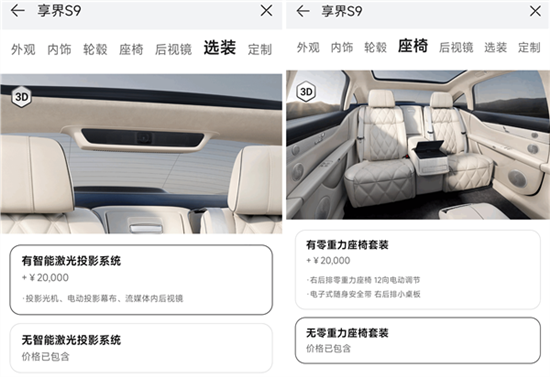 鸿蒙智行APP显示,享界S9 Max选装零重力座椅和智能激光投影的价格,均为2万元。