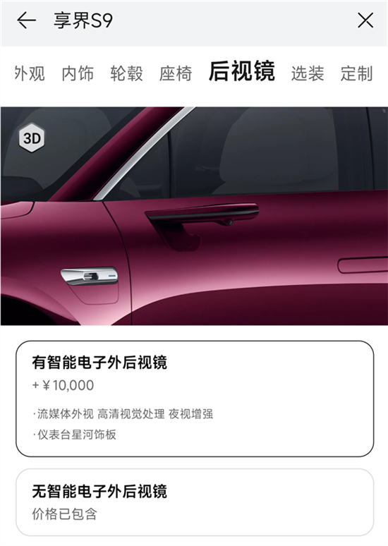此外,享界S9首发的智能电子外后视镜,Max和Ultra均是选配装置,选配价格为1万元,车主可按需选择。