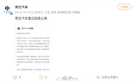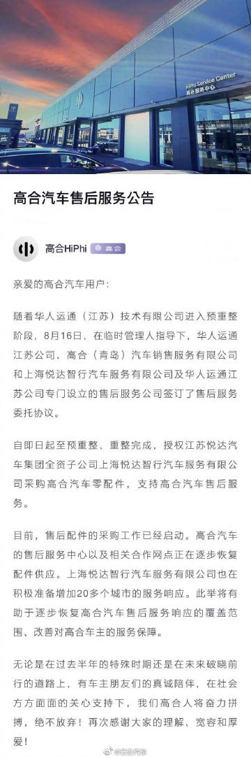 8月19日,@高合汽车 官方微博发文回应售后问题。高合汽车售后配件采购启动,服务中心和合作网点恢复供应,上海悦达智行汽车服务公司将增20城服务,为提升售后覆盖和服务保障。