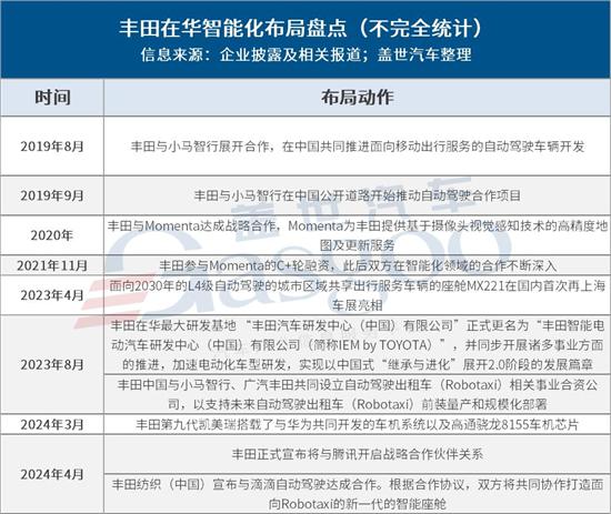 同样在2023年,8月4日,丰田中国与小马智行、广汽丰田共同设立自动驾驶出租车(Robotaxi)相关事业合资公司,以支持未来自动驾驶出租车(Robotaxi)前装量产和规模化部署。