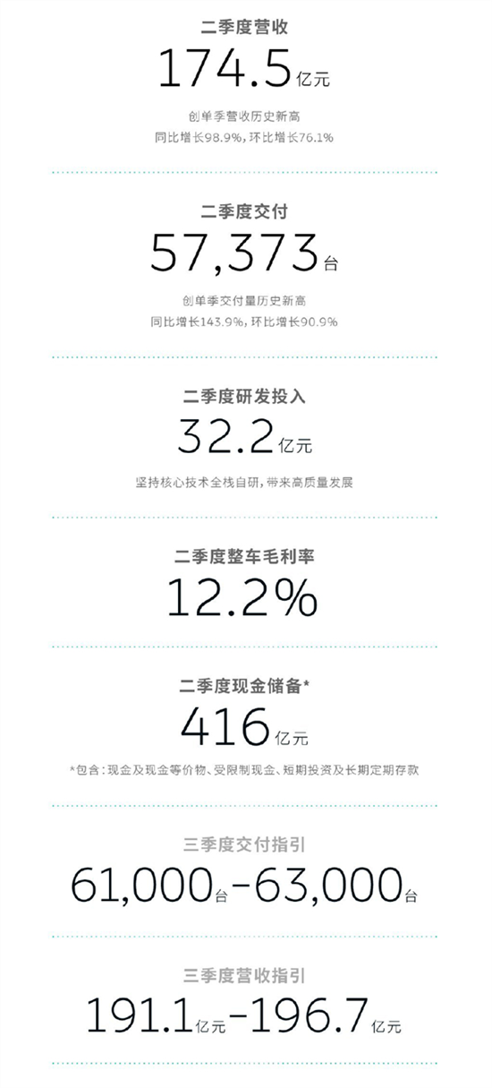 具体来看,蔚来二季度营收174.5亿元,同比增长98.9%,环比增长76.1%;交付量5.74万台,同比增长143.9%,环比增长90.9%,以上均创单季历史新高。