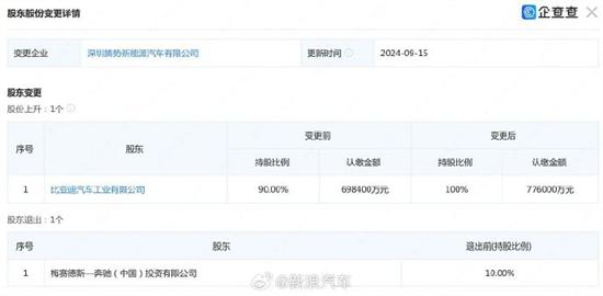 企查查显示,奔驰不再持有腾势10%股权,比亚迪将100%持有腾势股权,腾势正式从中外合资变为比亚迪独资控股企业。此次股权变更腾势、比亚迪、奔驰均未发表声明。