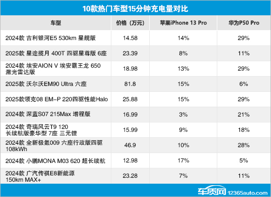 在针对华为P50 Pro的测试中,吉利银河E5、AION V埃安霸王龙和领克08 EM-P表现出色,充电量均达到了29%,极氪009的测试结果紧随其后,为28%。相比之下,沃尔沃EM90和小鹏MONA M03均不支持华为快充协议,充电量分别为6%和5%,表现一般。