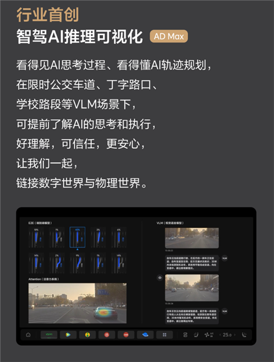据介绍,智能驾驶人机交互方面,OTA7.0版本新增AI推理可视化功能,针对限时公交车道、学校路段等VLM场景下,用户也能看到AI思考过程,理解AI轨迹规划。