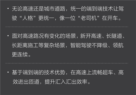 统一的端到端技术让驾驶“人格”更统一,面对高速路况变化场景,智驾不降级。