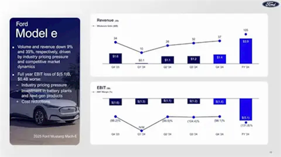 展望2025年,福特预计利润可能下降超过20亿美元,电动车和软件业务亏损预计在50亿至55亿美元之间。