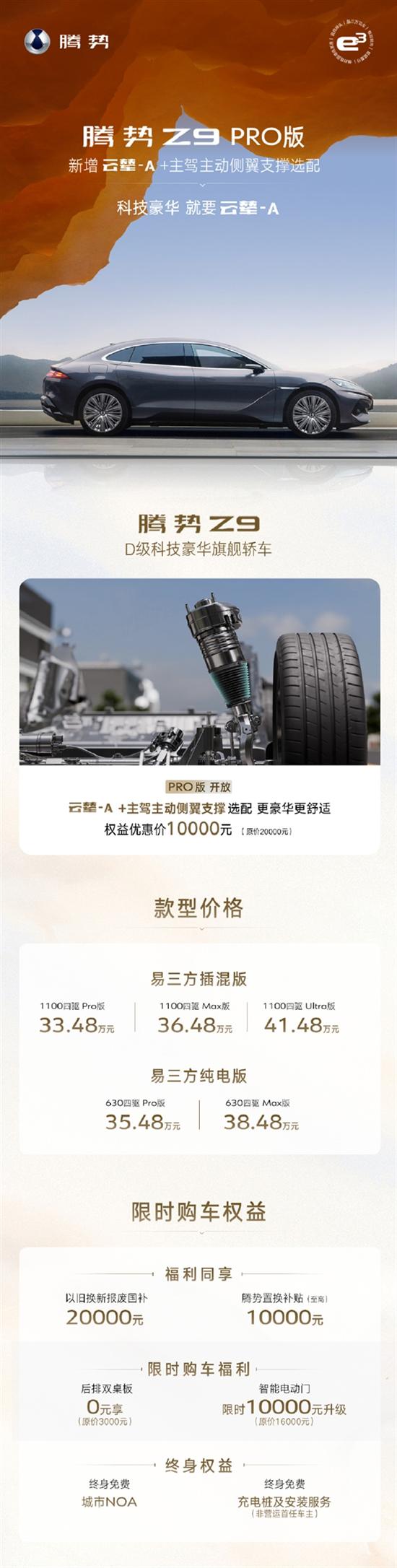 腾势Z9/Z9GT PRO版原生搭载云辇-C,此次开放选装后,用户仅需花费10000元,即可升级原价20000元的云辇-A(双腔空悬)+主驾主动侧翼支撑。