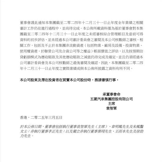 快科技3月6日消息,五菱汽车在港交所发布正面盈利预告,预计截至2024年12月31日止年度将录得净利润约1.04亿元人民币,较上一年度的6945.6万元增长约50%;
