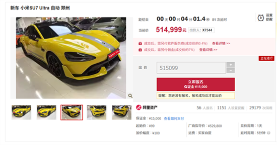 99元小米SU7 Ultra开拍 已竞拍到51万元