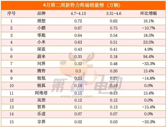 4月第二周新势力销量榜:大降价的蔚来暴涨