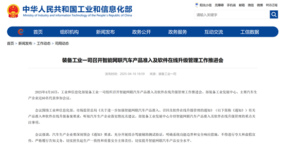 4月16日晚,工业和信息化部装备工业一司在工信部官网发布了公告,标题为《装备工业一司召开智能网联汽车产品准入及软件在线升级管理工作推进会》(以下简称“公告”)。公告特别强调,汽车生产企业需明确系统功能边界和安全响应措施,禁止夸大和虚假宣传,严格履行告知义务,切实承担生产一致性和质量安全主体责任,提升智能网联汽车产品安全水平。