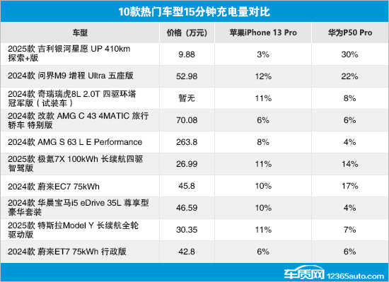 而在针对华为P50 Pro的测试中,吉利银河星愿、问界M9、极氪7X以及蔚来EC7均支持华为快充协议,所以在15分钟内的充电量非常出色。其中,吉利银河星愿充电量甚至达到了30%,测试结果明显高于其他测试车型。相比之下,AMG S 63和华晨宝马i5的测试成绩垫底,两者充电量均不足5%。