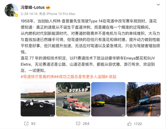 莲花汽车CEO冯擎峰在小米SU7 Ultra发布时也曾在社交媒体上表达过类似观点,他认为对赛道的敬畏不是单纯依靠电机和马力的堆积。