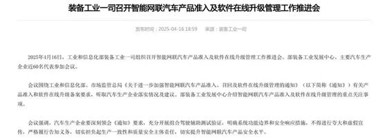 4月16日,工信部装备工业一司组织召开了智能网联汽车产品准入及软件在线升级管理工作推进会,明确系统功能边界和安全响应措施,不得进行夸大和虚假宣传,严格履行告知义务,切实承担生产一致性和质量安全主体责任,提升智能网联汽车产品安全水平。