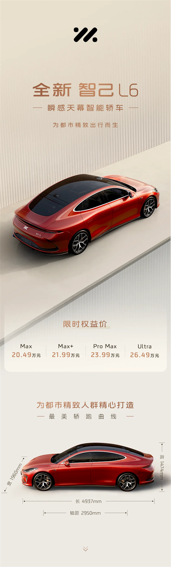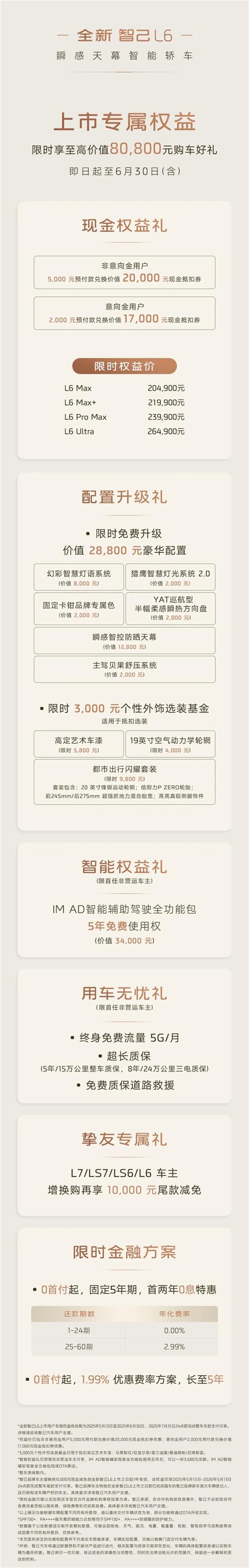 全新智己L6已正式上市,共推出4款车型,CLTC工况续航里程为690-850km,售价区间为20.49万-26.49万元。