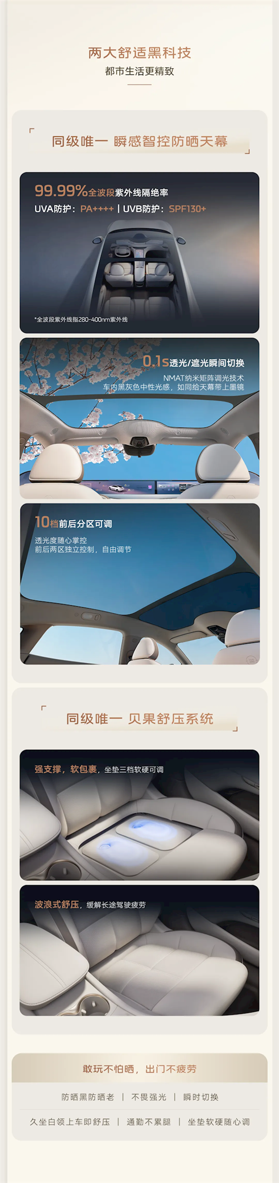 车顶虽然为全景天幕,但全系标配10档前后分区可调的变色天幕,0.1秒即能在透光/遮光模式间切换。