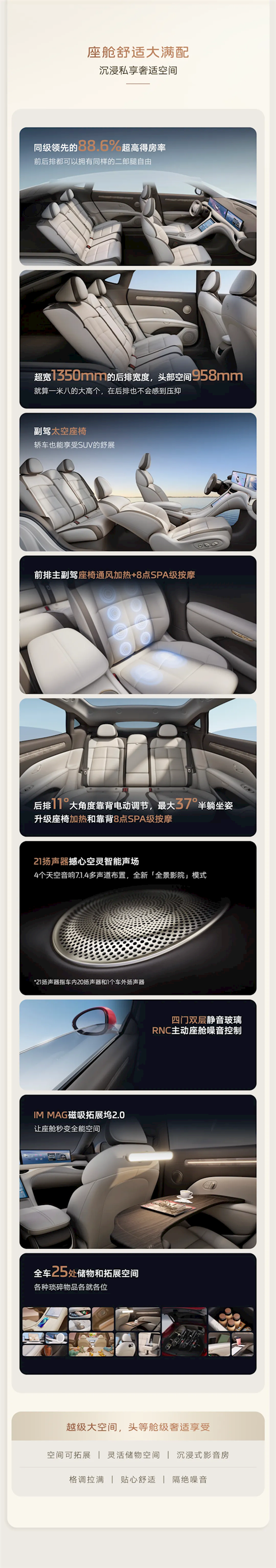 得益于5米长的车身,车内拥有1350mm的后排宽度,一米八的大高个也不会觉得压抑。副驾配备了太空座椅,舒展性比肩SUV。前排主副驾座椅通风加热及8点SPA级按摩,舒适性拉满。