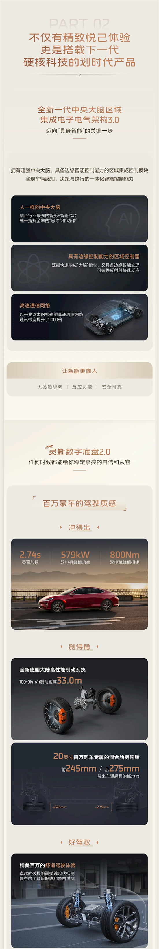 动力上,提供单电机后驱和双电机四驱两种动力形式,Ultra版为双电机性能车型,最大功率579kW,峰值扭矩800N·m,极速超300km/h。