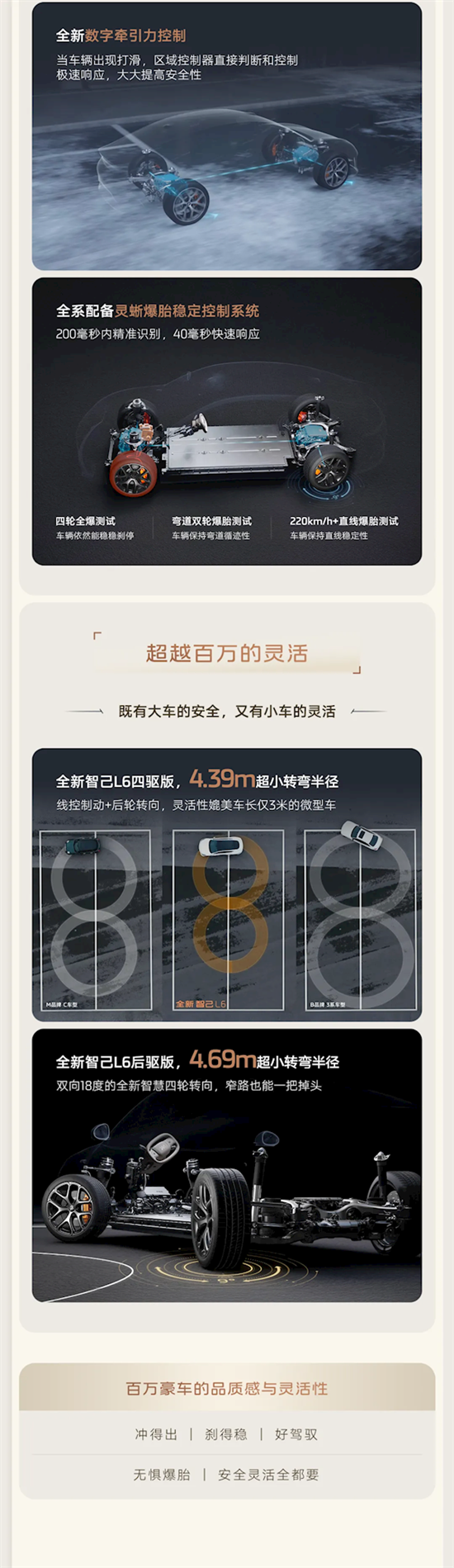 智己L6的价格、配置、动力水平都极其能打,全系标配800V超快充平台、英伟达Oron-X芯片、高精度激光雷达、灵犀数字底盘2.0、智慧四轮转向系统、高通骁龙8295芯片、四门双层静音玻璃、21扬声器、前排座椅通风加热按摩、智能冷暖箱、雨夜模式、调光天幕、VIP弹幕尾灯、前一体式大陆四活塞固定卡钳等,可谓入门即高配。