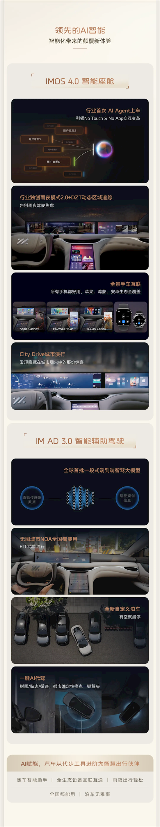 车内配备IMOS 4.0智慧座舱,行业首次AI Agent上车,语音智能化体验提升明显。车内还配备有独有的雨夜模式2.0及DZT动态区域追踪,夜间雨天也能有清晰视线。
