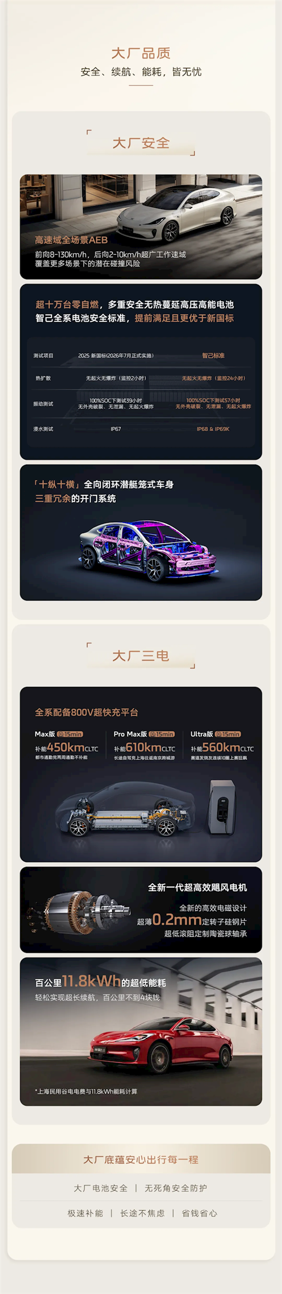 Max、Pro Max和Ultra三个版本的0-100km/h加速时间分别为5.9s、4.6s和2.74s;电池容量上,Max版为74kWh电池包,CLTC工况续航里程为690km;Pro Max和Ultra版均为100kWh电池包,续航分别为850km和780km。充电15分钟,最高补能610km。