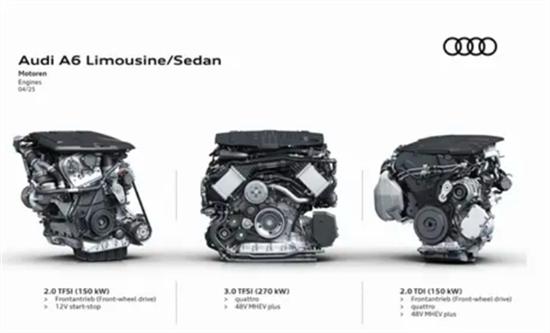 动力上,海外版全新奥迪A6轿车提供多款动力系统,2.0TFSI汽油发动机最大功率150千瓦,3.0TFSI汽油发动机最大功率270千瓦,还带有quattro四驱系统及48伏MHEV plus轻混系统。